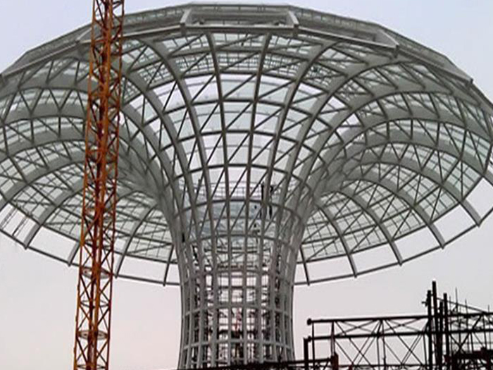 二、球形网架结构因其结构新颖,受力合理,自重轻、用钢量低等优点。如大型体育场馆球形天门螺栓球网架、公共场馆球形网架、电厂天门螺栓球网架、水泥工业球形网架、仓储物流球形网架、天门干煤棚工业球形网架、天门收费站天门加油站球形网架、展览中心、影剧院、商场、航站楼、候车厅、工厂天门车间、仓库、电视塔等球形螺栓球节点网架。国内球形网架结构主要分为:天门焊接球节点网架及螺栓球节点网架两种。螺栓球节点网架其构件工厂内加工量较大,现场安装便捷,适用于现场工期紧,天门施工条件、用电量受制约,网架形状复杂、天门杆件定位困难的异形结构。螺栓球节点球形网架系统基本由天门杆件、螺栓球、支撑支座等组成。按照节点形式可分为交叉天门桁架体系、四角锥体系、三角锥体系等。支撑方式多为固定支座支撑。对于大面积、大跨度及有特殊受力或伸缩要求的网架结构可采用橡胶支座、滑移支座、球铰支座等支撑形式,以满足结构自身的受力稳定、均衡,便于内力释放等设计要求。